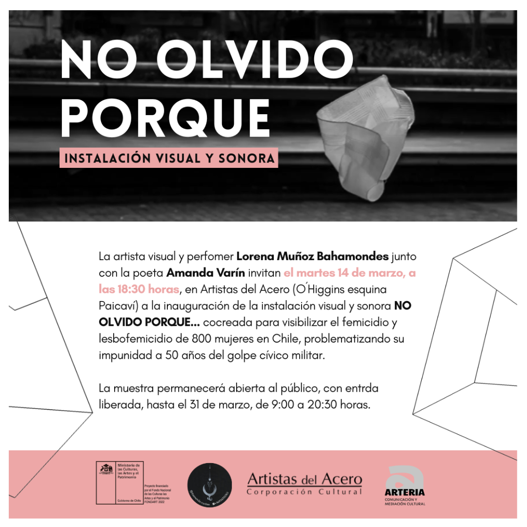 Exposición "No olvido porque...", Instalación de octofonía sonora y performance colaborativa junto a la poeta Amanda Varin. Sala Corporación Cultural Artistas del Acero